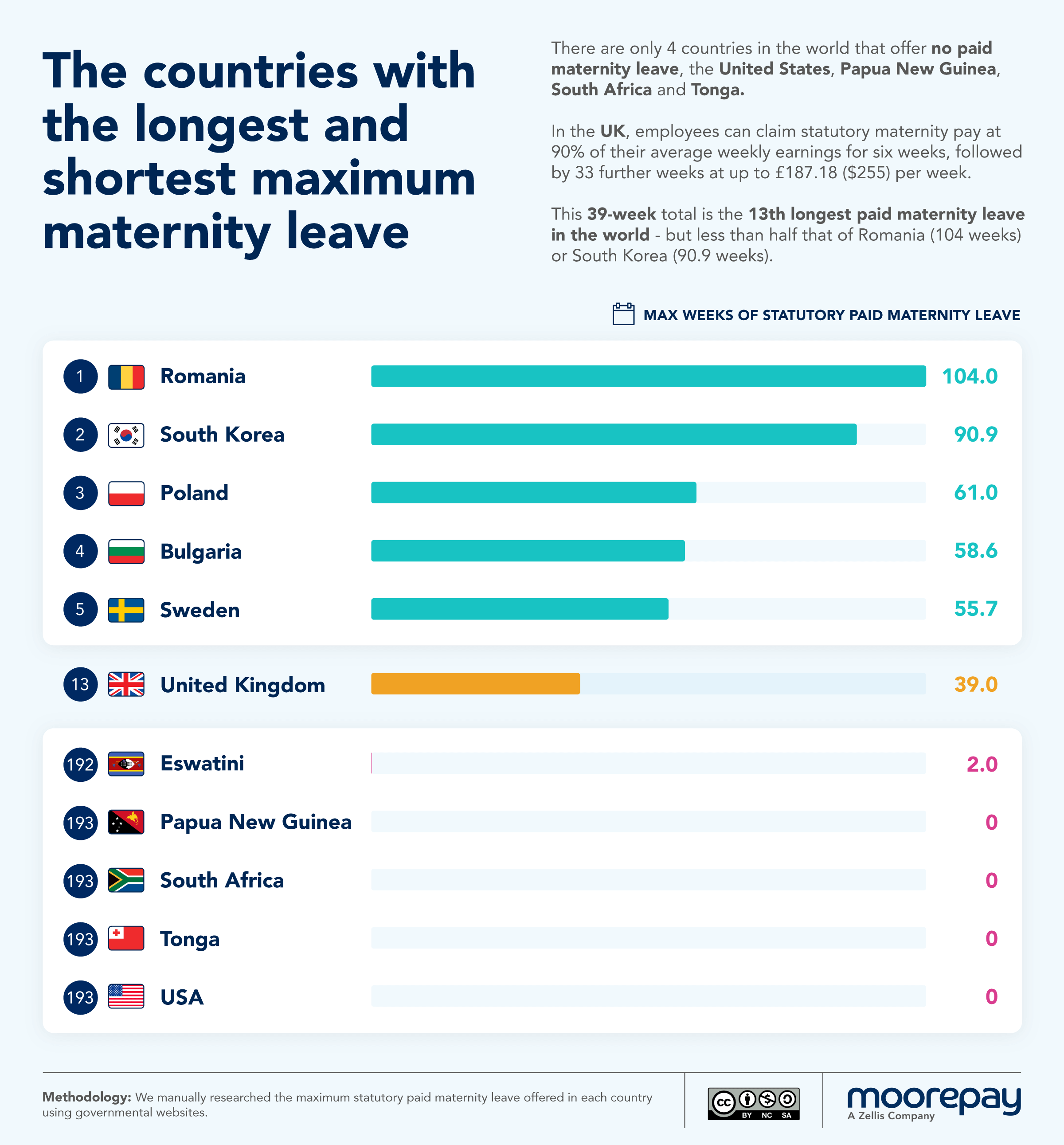 Aunque el permiso de maternidad es un derecho fundamental para proteger la salud tanto de la madre como del recién nacido en esos meses clave de su desarrollo, la duración y retribución varía enormemente según el país. Lo demuestra un informe de la consultora británica Moorepay que analiza la duración y la retribución de los permisos de maternidad en el mundo. El informe se centra solo en los permisos de los que disfrutan las madres, no los padres. En España existen desde 2021 permisos de maternidad y paternidad iguales e intransferibles para ambos progenitores, pero esto no es así en la mayoría de los países, incluidos muchos europeos como Francia, Alemania, Italia o Polonia, que ofrecen escasas licencias a los nuevos padres.
