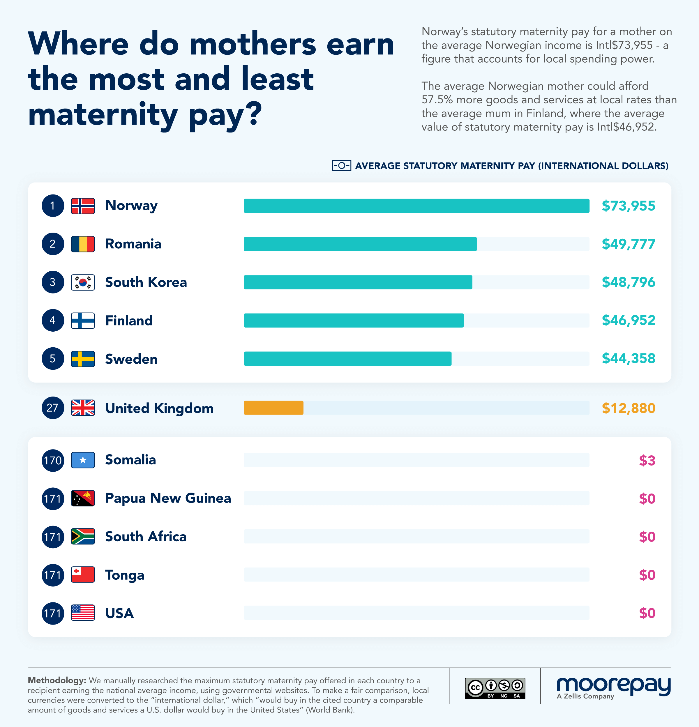 Noruega es el país donde mejor se retribuyen los permisos por maternidad: unos 73.955 dólares internacionales, una cifra que multiplica por seis la española. Detrás se sitúan Rumanía, con un valor de 49.777 dólares internacionales, y Corea del sur, con 48.796 dólares internacionales. En Finlandia, Suecia, Eslovenia y Luxemburgo, la cobertura económica a las nuevas madres también es acusadamente más alta.