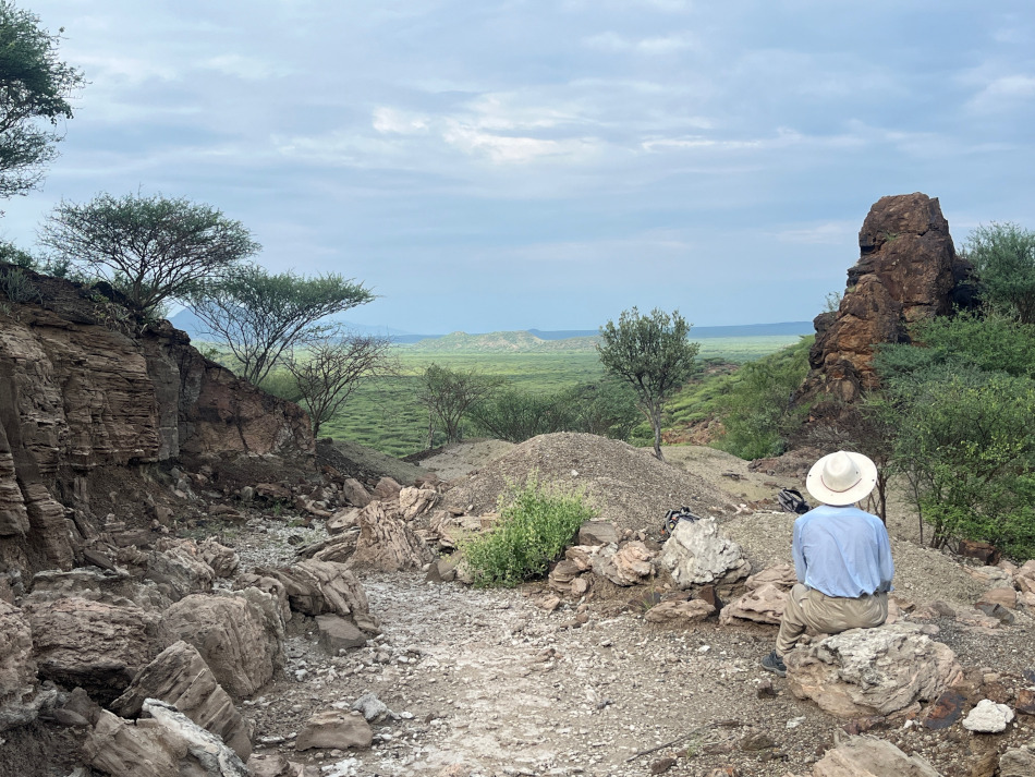 Durante la duración del campamento, la vida y el trabajo se desarrollan en un entorno muy particular, marcado por la rutina, el trabajo en el yacimiento, la convivencia en el campamento y la adaptación a condiciones duras y distintas a lo que estamos acostumbrados. Es una zona semidesértica, con altas temperaturas y escasez de agua. La vida salvaje y sus gentes son rudas y duras como el ambiente. Es una experiencia intensa, tanto a nivel profesional como personal. El día comienza con la salida del sol, sobre las 6 de la mañana. Desayunamos y nos dirigimos hacia el yacimiento, que está a unos 45 minutos: 20 en coche y unos 25 caminando. Allí estamos hasta las 16.30 horas más o menos, con una parada de un par de horas para comer y descansar en las horas centrales del día, cuando el calor es más intenso. Tener la oportunidad de leer un rato después de comer con vistas al monte Nakali es una experiencia que no cambio por nada. Cuando volvemos al campamento por la tarde, es la hora del té. Se toma un té infusionado en leche y servido a una temperatura imposible de asumir para mí. Esta es también la hora de conversar, nos sentamos alrededor de la mesa y hablamos del país, de la familia, de la vida en general. Para mí es también la hora de practicar suajili. Los compañeros me enseñan y escuchan pacientemente mientras intento articular un discurso con sentido. Este rato hasta que se va el sol (sobre las 18.30-19.00 horas) aprovechamos también para ducharnos antes de cenar sobre las 20 horas. Alrededor de las 21 o las 21.30 estamos ya en la cama. Cuando hablo de campamento hay que tener en mente que es algo muy básico. Dormimos en tiendas de campaña, el baño es un agujero en el suelo, la ducha un círculo de paredes de plástico y la cocina una pequeña hoguera. La comida es muy básica también, comemos fundamentalmente arroz con verduras y cabra, que se compra a los vecinos de la zona. Incluso con estos pocos medios, nuestro cocinero Mutuku nos deleita con platos típicos kenianos, como el chapati, el ugali o los mandazi (lo que se conoce como el donut keniano). La vida en el campamento es dura y simple, pero para mí es un reto diario que me enriquece en todos los sentidos y ha fomentado mi capacidad de adaptarme a situaciones muy diferentes a lo que estamos acostumbrados en el norte global. Además, no hay ningún tipo de conexión, ni internet ni de telefonía, por lo que supone una oportunidad única para desconectar. En cuanto al trabajo, lo que hacemos básicamente es buscar fósiles y hay diferentes maneras de hacerlo. A veces simplemente caminamos por un área concreta en busca de los fósiles que se encuentren en superficie. Durante los últimos años, nos hemos centrado en realizar lo que se llama una excavación sistemática, que no es otra cosa que seleccionar un lugar concreto y excavar en profundidad, con paciencia y destreza en busca de los restos que esperan bajo tierra. Muchas veces, el sedimento que generamos (la tierra) se pasa por unos tamices para rastrear los fósiles más pequeños y que cuesta más de ver a simple vista. Sin embargo, los integrantes del equipo tienen años de experiencia y conocen su tierra como ninguno, es difícil que se les pase ningún fósil.
