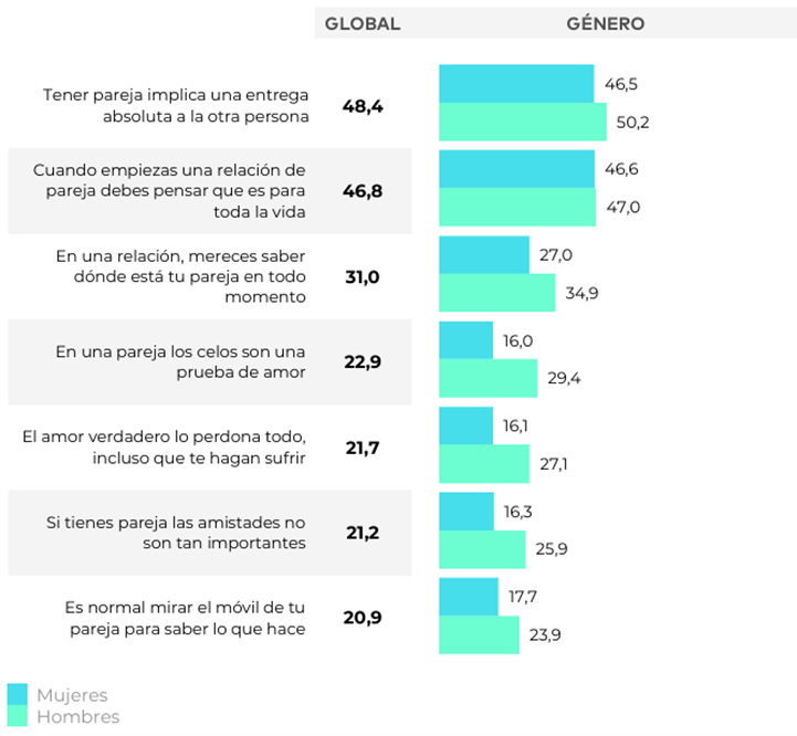 Además, cerca de la mitad se muestra de acuerdo con postulados ligados al amor romántico: el 48,4% está de acuerdo con que tener pareja implica una entrega absoluta a la otra persona y el 46,8% considera que debería pensarse como un proyecto para toda la vida desde el inicio. Un 31% cree que merece saber dónde está su pareja en todo momento, un 22,9% interpreta los celos como prueba de amor y un 20,9% normaliza revisar el móvil de la pareja. Aunque no son posiciones mayoritarias, muestran la coexistencia de ideas tóxicas y posesivas del vínculo.