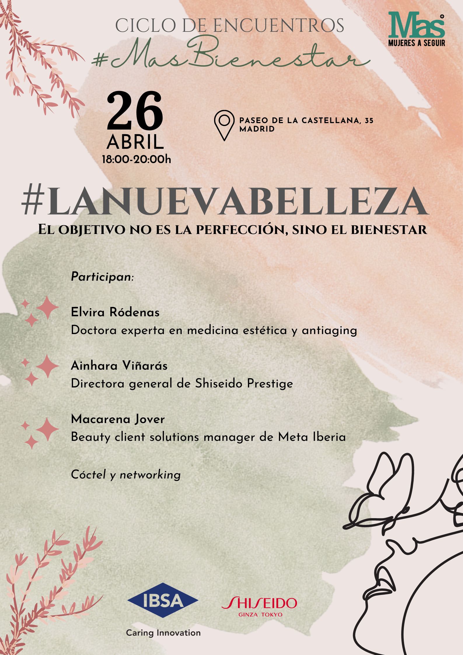Esta jornada, organizada con el apoyo de IBSA Iberia y Shiseido, será la primera del ciclo #MASBienestar, que en próximas sesiones abordará otros temas como la alimentación o la salud mental. En ella participarán la doctora Elvira Ródenas, experta en medicina estética y antiaging; Ainhara Viñarás, directora general de Shiseido Prestige, y Macarena Jover, beauty client solutions manager de Meta Iberia. Con ellas debatiremos sobre los cambios en el canon de belleza, el impacto que están teniendo movimientos como el body positive o el body neutrality y el papel de la cosmética en este nuevo paradigma.