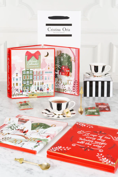 Cristina Oria ofrece otro con tés e infusiones. El kit incluye, además, un juego de taza y plato de su icónica vajilla blanca y negra. Cristina Oria (29,50 euros).