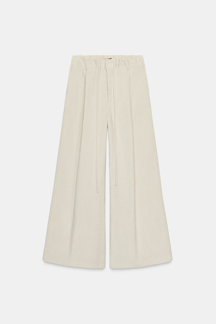 Pantalón realizado en tejido de pana y co detalle de pliegues en la parte delantera. Tiro medio y cintura con trabillas ajustable con lazada.