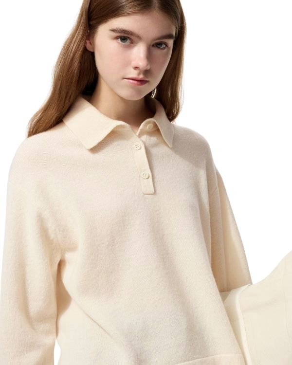 Aunque se ofrece también en otros colores (rojo y gris), el blanco es el color en el que más llama la atención en este jersey 100% lana con cuello polo que pertenece a la colección creada por Jonathan Anderson para el gigante japonés.