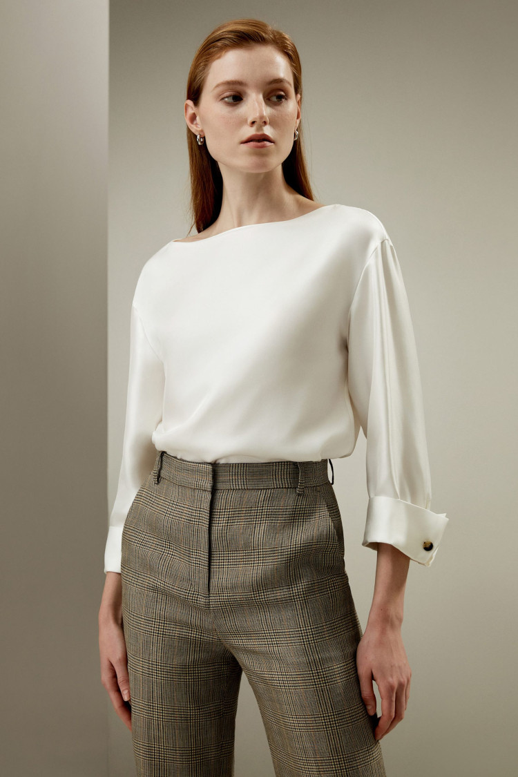 Con un escote de barco, mangas tres cuartos y detalles de puños franceses es una elección perfecta para cualquier ocasión.