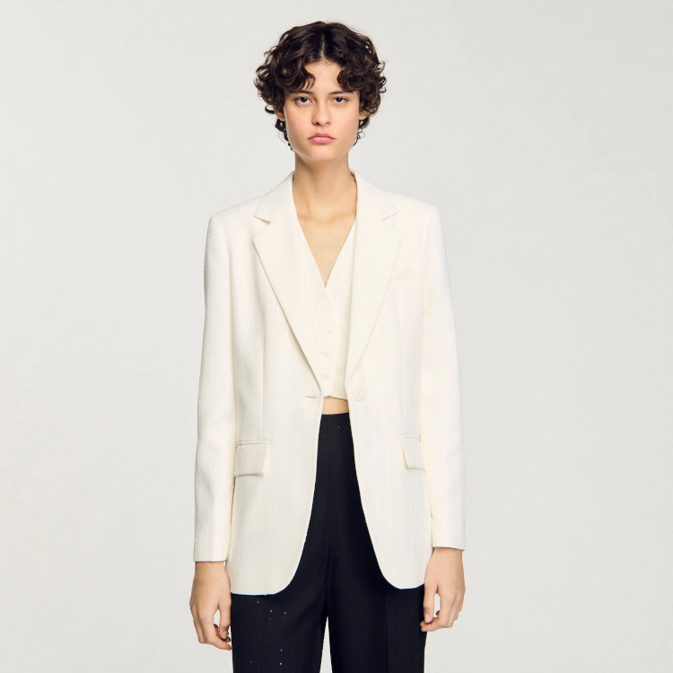 Chaqueta de traje a rayas con detalle de lentejuelas en el mismo tono.
