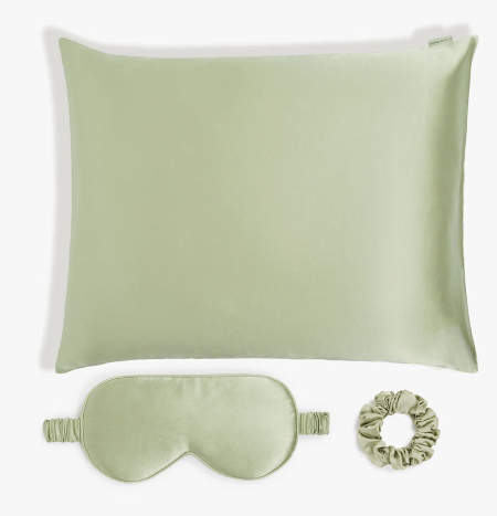 Almohada, antifaz y coletero fabricados en seda para proteger la piel y el pelo mientras duermes.